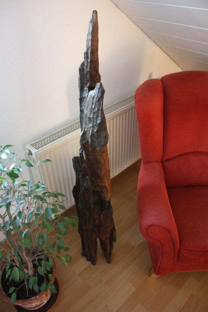 Diese Skulptur wurde allein von der Kraft des Wasser geformt. Sie lag – vermutlich viele Jahre – in einem kleinen Fluss in der Rhön. Die Strömung hat der Skulptur im Laufe der Zeit ihre natürliche Form gegeben. Ihre Farbe erinnert mich ein wenig an Mooreiche.